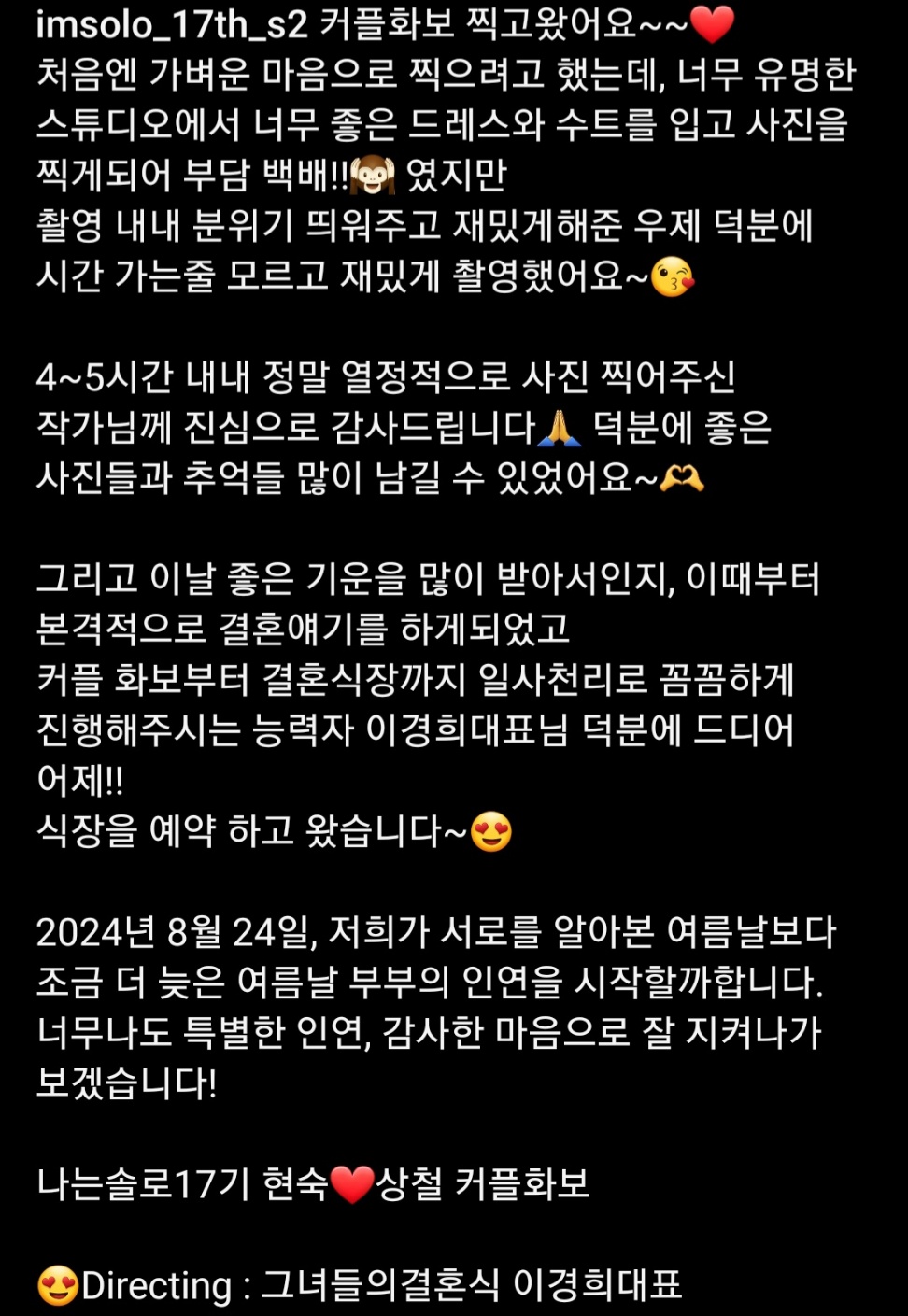 너무나도 응원하는 커플이기에 좋은 소식 들려줘서 정말 고마워요. 두 분 항상 앞날에 행복이 가득하시길 바랍니다. 얼른 나솔 3호 베이비가 될 수 있는 아이도 낳고 더 기쁨이 배가 되시길 바랍니다. 결혼 축하드립니다.