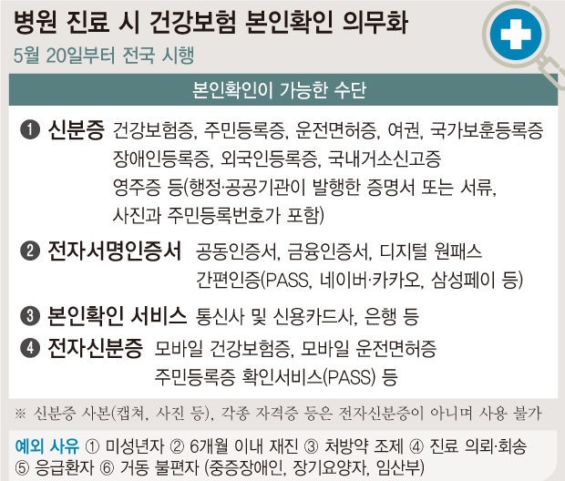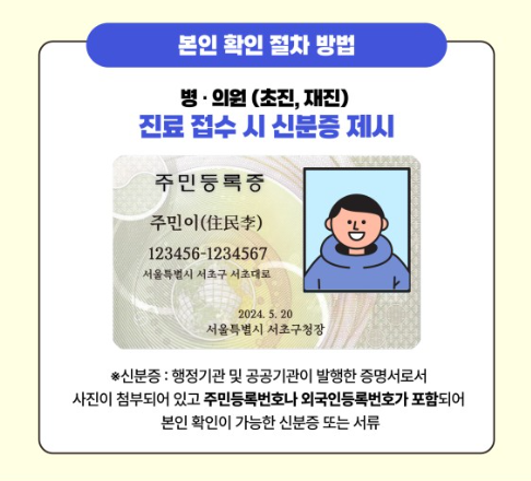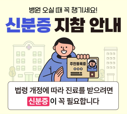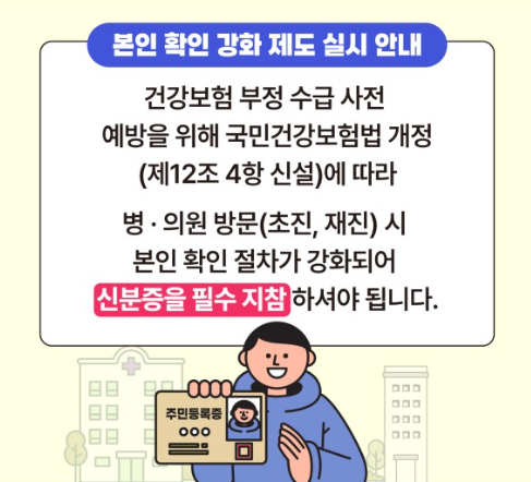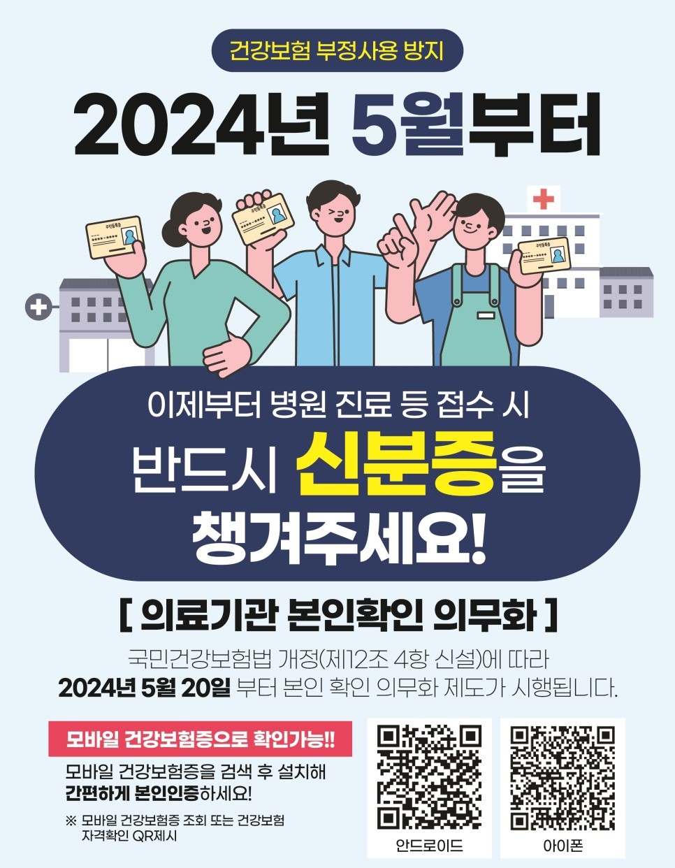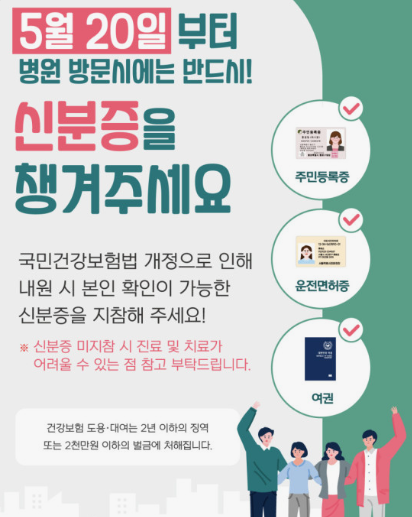 2024년 5월 20일부터 국민건강보험법 개정 (제12조 4항 신설)에 따라 건강보험으로 진료를 받을 때 본인 여부를 확인합니다. 앞으로는 병. 의원 방문(초진, 재진) 시 신분증을 필수 지참해야 합니다.