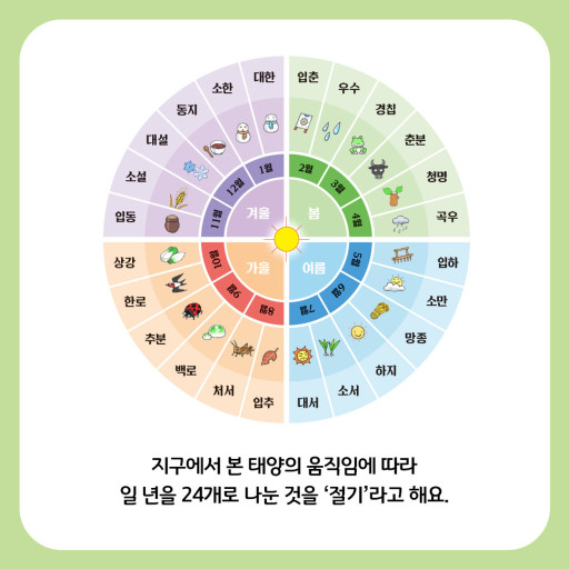 각각의 절기는 자연 현상과 농사일과 관련이 있습니다.그래서 1달 안에는 보통 2개의 절기가 있다고 기억하시면 됩니다.