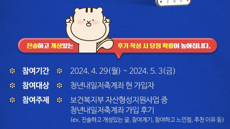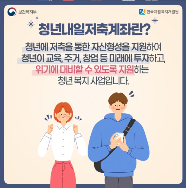 근로빈곤층 청년의 생계수급자 등으로의 하락을 사전에 예방하고 일하는 중간계층 청년이 사회에 안착할 수 있도록 자산형성을 지원하는 청년내일저축계좌 제도가 여러분의 미래에 도움이 많이 되셨으면 좋겠습니다.