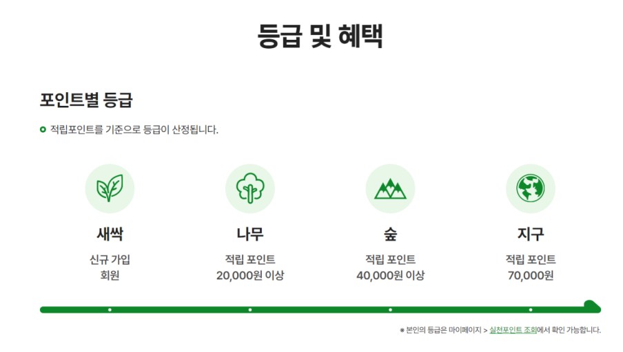 ✅ 적립포인트를 기준으로 등급(새싹, 나무, 숲, 지구)이 산정됩니다.