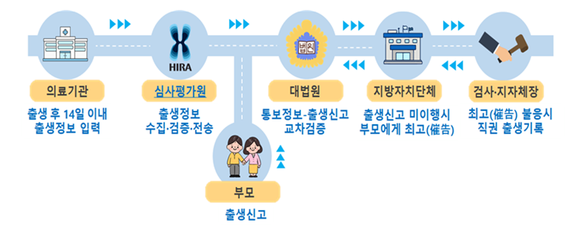 출생신고가 누락되는 아동이 없도록 하고자 아동의 출생정보를 시∙읍∙면에 통보하여 보호합니다. 의료기관의 출생 아동의 정보를 통보하는 과정에서 의료기관에서 사용 중인 전자의무기록(EMR∙OCS)을 활용해 행정 부담을 줄여 출생통보제가 잘 시행될 수 있도록 7월 19일부터 개선됩니다.