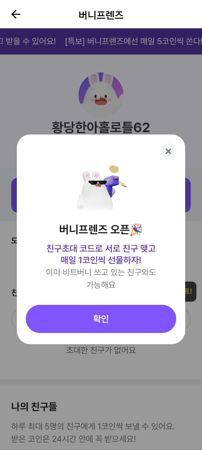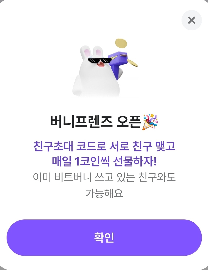 버니프렌즈를 누르면 저렇게 새로 오픈했다고 팝업이 뜹니다. 친구 초대 코드로 서로 친구 맺고 매일 1 코인씩 선물하자! 이미 비트버니 쓰고 있는 친구와도 가능해요라고 쓰여 있네요.