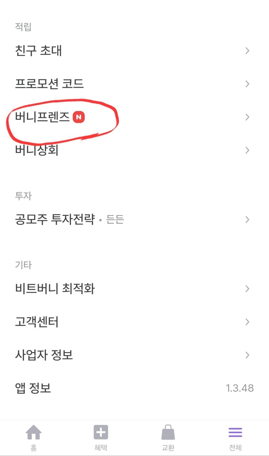 홈버튼이 있는 곳 오른쪽에 있는 전체 버튼을 누르면 버니프렌즈라고 쓰여있고 그 옆에 빨간색으로 N이라고 되어 있습니다.
