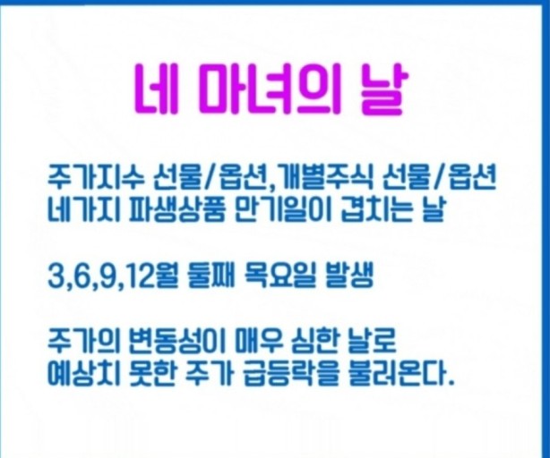 3월,6월,9월,12월 둘째 목요일에 발생하고 주가의 변동성이 매우 심한 날로 예상치 못한 주가 급등락을 불러올 수 있음을 꼭 기억하시길 바랍니다.