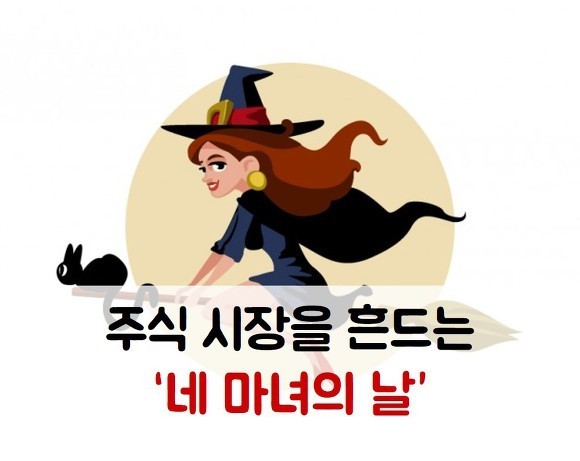 주가지수 선물과 옵션, 개별 주식 선물과 옵션 등 네 가지 파생상품 만기일이 겹치는 날을 OOOOO(이)라고 해요. 3월, 6월, 9월 12월 둘째 목요일에 발생해요. 이 날은 주가가 요동치는 경우가 많아 "마녀가 심술을 부린다"는 뜻으로 부르는 단어예요.