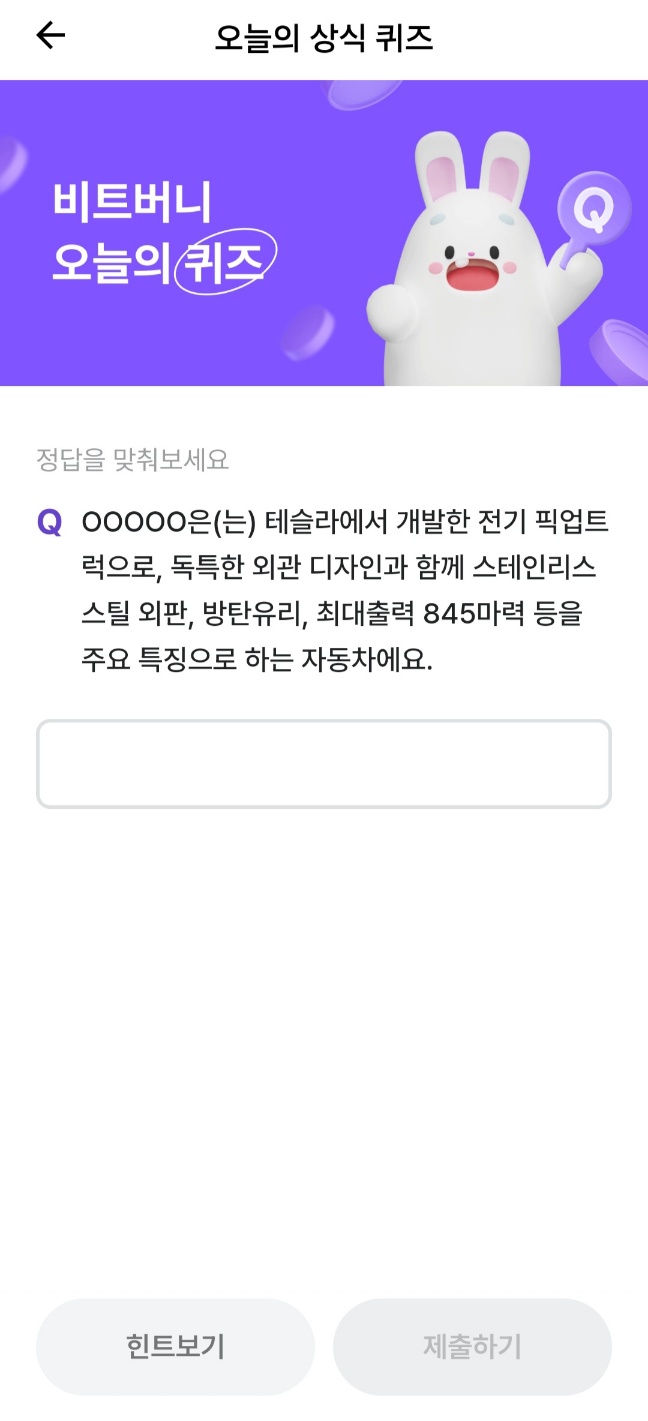 자 오늘의 상식 퀴즈 문제 나갑니다~~ OOOOO은(는) 테슬라에서 개발한 전기 픽업트럭으로, 독특한 외관 디자인과 함께 스테인리스 스틸 외판, 방탄유리, 최대출력 845마력 등을 주요 특징으로 하는 자동차예요. 무엇일까요?